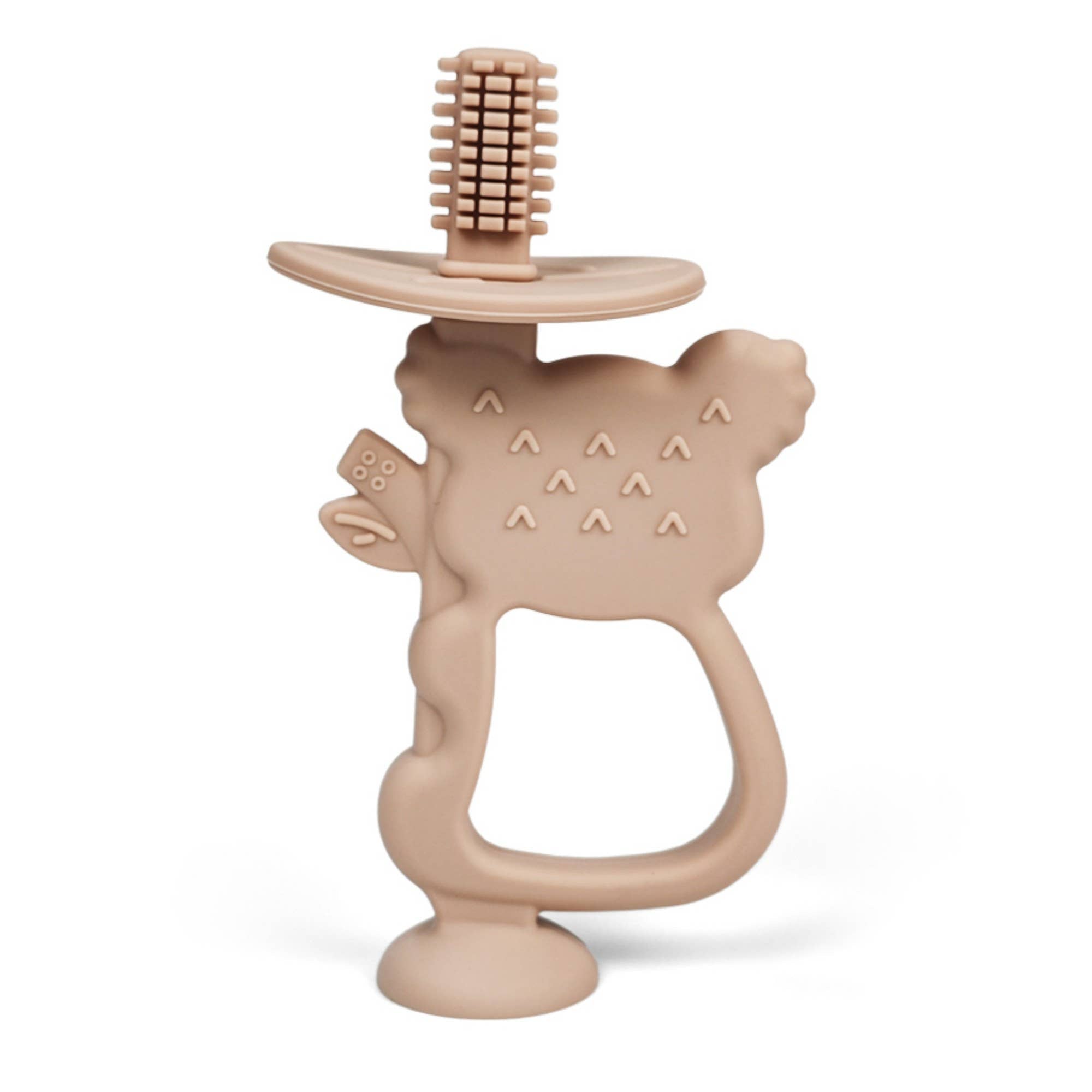 Start teaching your baby good brushing habits with the Koala Toothbrush! This training toothbrush is designed specifically for infants' and toddlers' small, sensitive mouths. Intended to be introduced when babies first begin teething and they instinctively want to stick everything in their mouths. The soft silicone bristles will gently massage sore teething gums when the brush is rubbed against them.
