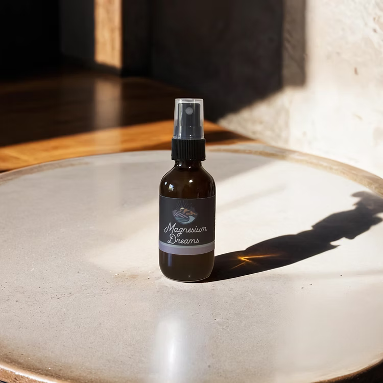 Natural sleep aid and cortisol regulator, use this spray to gently massage arms, legs, feet and/or stomach. Sometimes the oil can sting or itch a bit, especially when you first start using and if you are deficient. Begin ritual 30 minutes before bed.