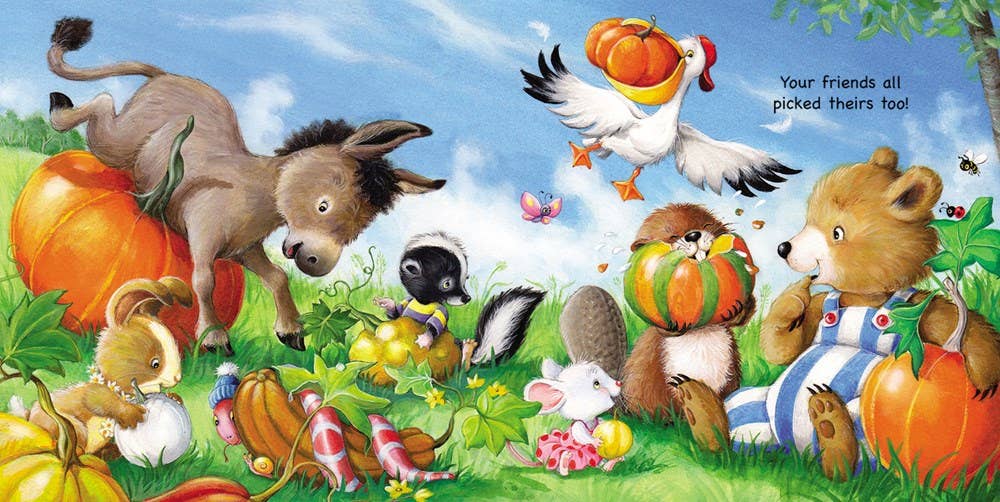 Bear Picks a Pumpkin is the perfect board book to snuggle up with in the fall. The whimsical, rhyming text tells the story of Bear on a quest to find the perfect pumpkin. Will he choose a tall one?... A tiny one?... One with stripes?... Read along and find out which pumpkin Bear (and his friends) will choose!
