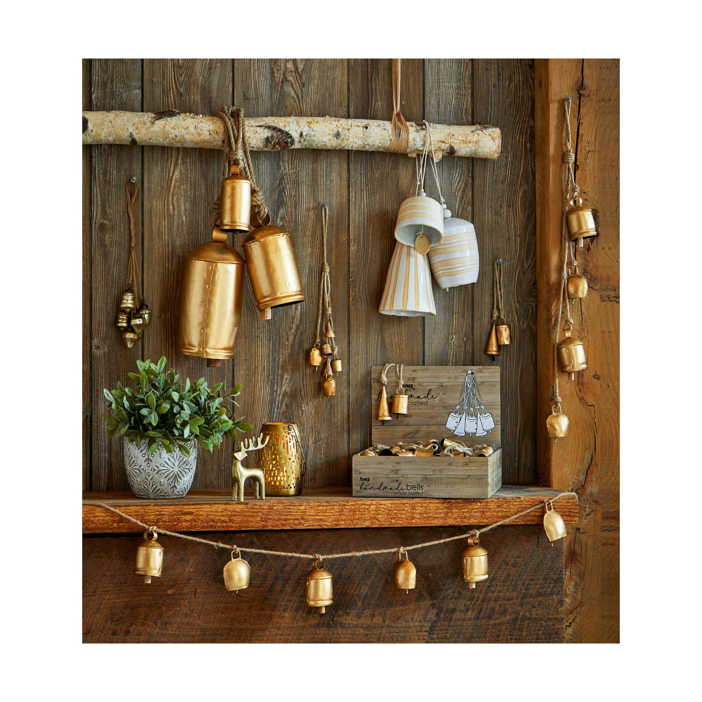 Add a distinctive, magical touch to your home this holiday season. Made from wrought iron, mango wood, and jute these hanging bells are the perfect addition to any mantel, window ledge, or chair back. The weathered, antique look brings a vintage vibe without sacrificing style or elegance. Mix and match with multiple sizes and styles for a more dramatic effect. Hand assembled. Slight color variations are to be expected—each piece is one-of-a-kind, no two pieces will be exactly alike.
