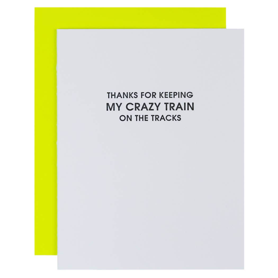 "Thanks for keeping my crazy train on the tracks" card is letterpress printed on a vintage printing press.