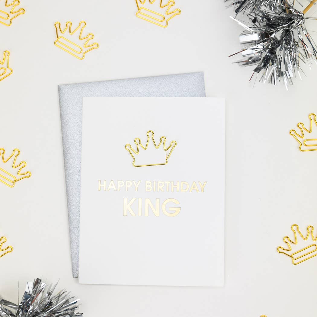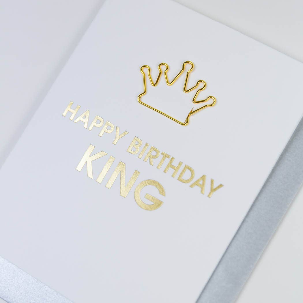 Our "Happy Birthday King" card is gold foil printed on a vintage printing press. Card includes a heavy duty crown-shaped paper clip.